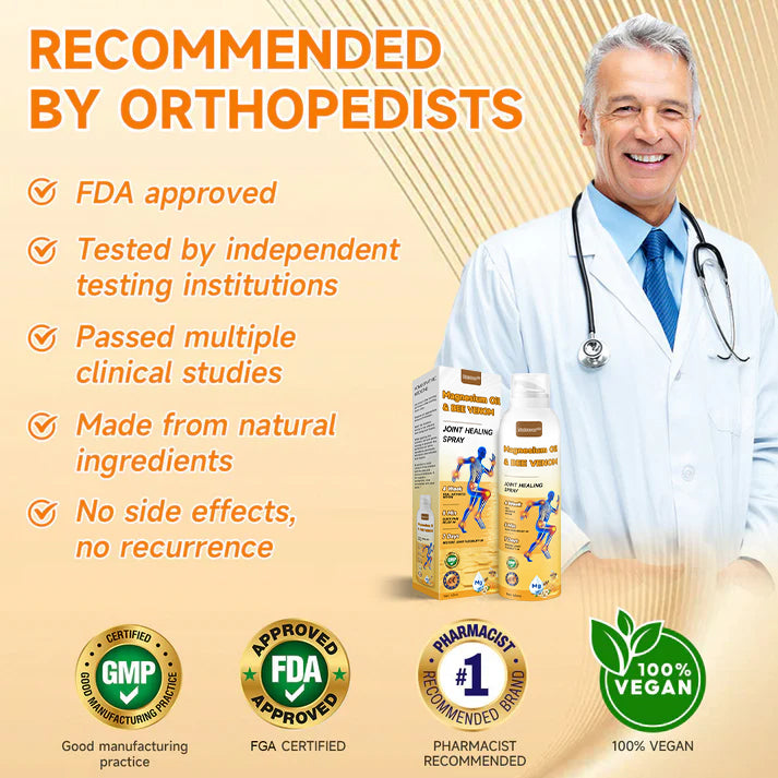 "As an orthopedic surgeon, I endorse ADNOON™ Magnesium Oil & Bee Venom Joint Healing Spray for individuals suffering from joint and bone conditions such as osteoarthritis, rheumatoid arthritis, and other inflammatory disorders. This spary contains active ingredients like bee venom filtrate, glucosamine, and chondroitin, which work to alleviate inflammation, nourish joints, and enhance mobility. It also aids in rebuilding and restoring cartilage and bone tissue, alleviating pain and stiffness while eliminating harmful crystals that can accumulate in joints, thereby improving overall joint function."
