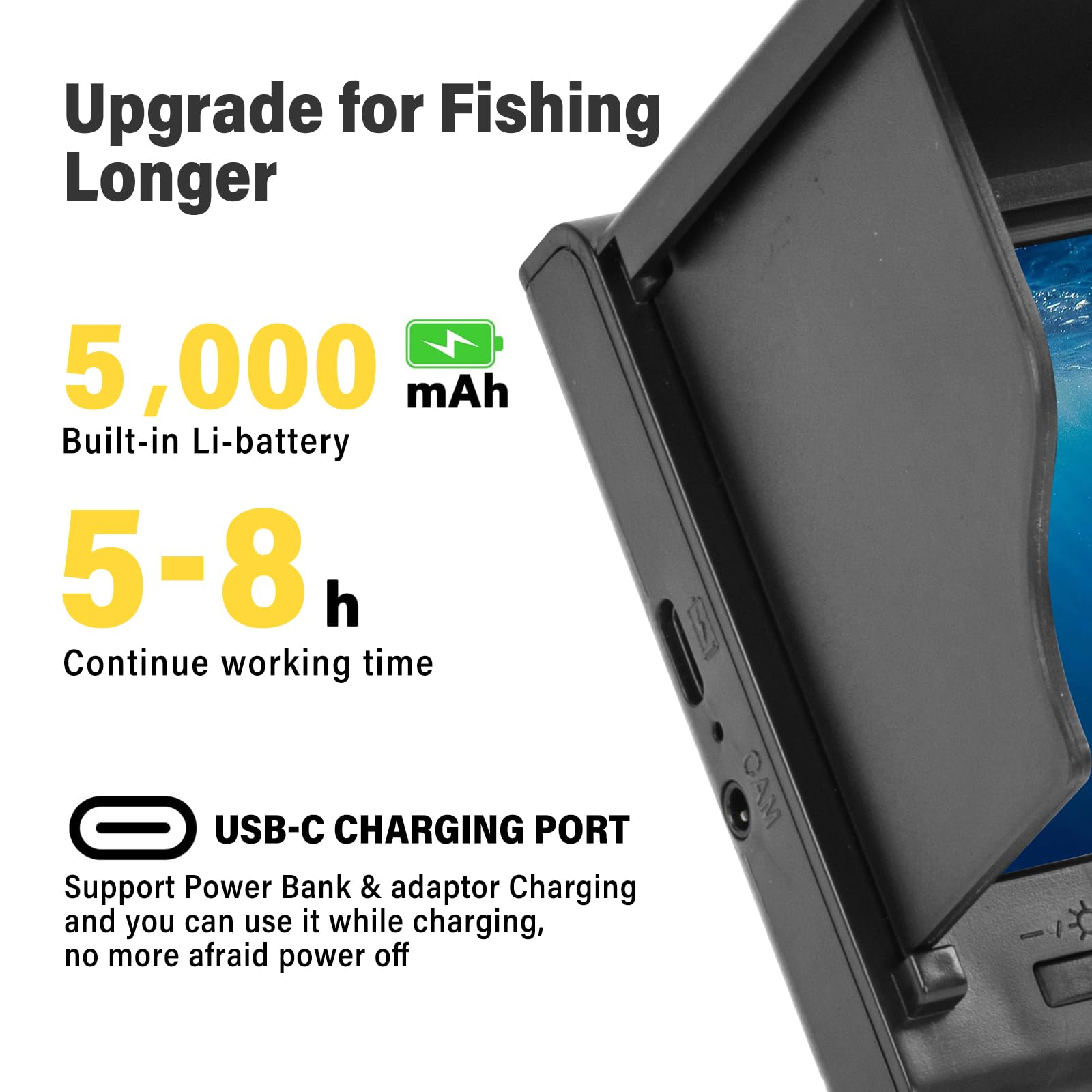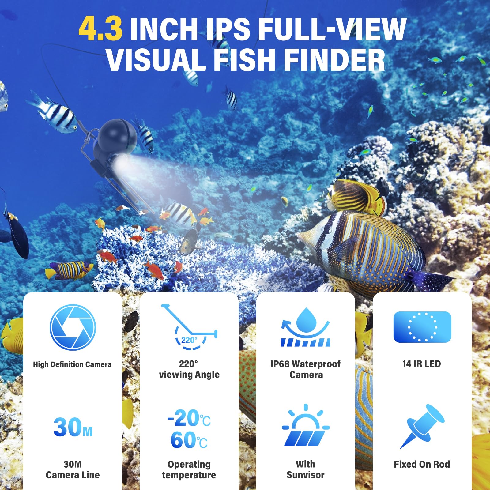 Capture more, miss less – the 120° wide-angle lens provides an expansive view of the underwater landscape, allowing you to effortlessly spot fish schools, underwater structures, and changes in terrain. Perfect for covering large areas and observing how fish interact with their environment.